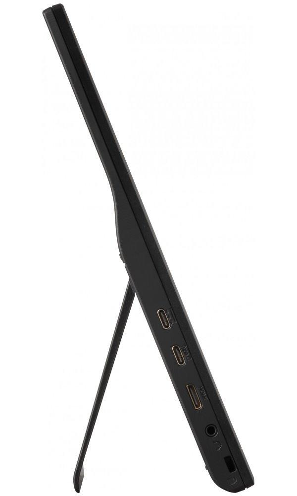 Ultratenký přenosný monitor s úhlopříčkou 15,6" a Full HD rozlišením 1920 x 1080 bodů. Nabízí jas 250 cd/m2 a kontrastní poměr 800:1. Příjemné jsou také pozorovací úhly 170° horizontálně i vertikálně. Základní ozvučení zajišťuje dvojice reproduktorů s celkovým výkonem 1,6 W. Pro připojení k notebooku vyžaduje pouze jediný kabel USB typu C, a to jak pro video signál, tak i pro napájení.