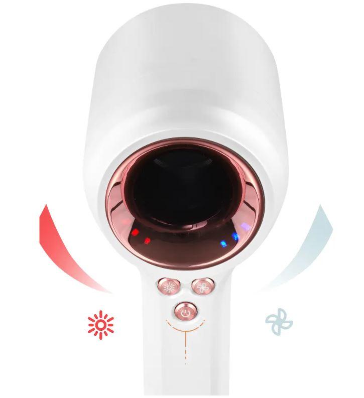 Fén na vlasy nabízí hned 4 nastavení teploty – rychlé vysoušení a styling, běžné vysoušení, šetrné vysoušení a stálý proud chladného vzduchu. Nastavit se dají jednouduše stisknutím levého tlačítka. Kromě teploty lze navolit 1 ze 3 rychlostí – nízkou, střední a vysokou. Pro rychlé a dokonalé vysušení stačí vybrat kombinaci vysoké teploty a rychlosti proudění vzduchu.