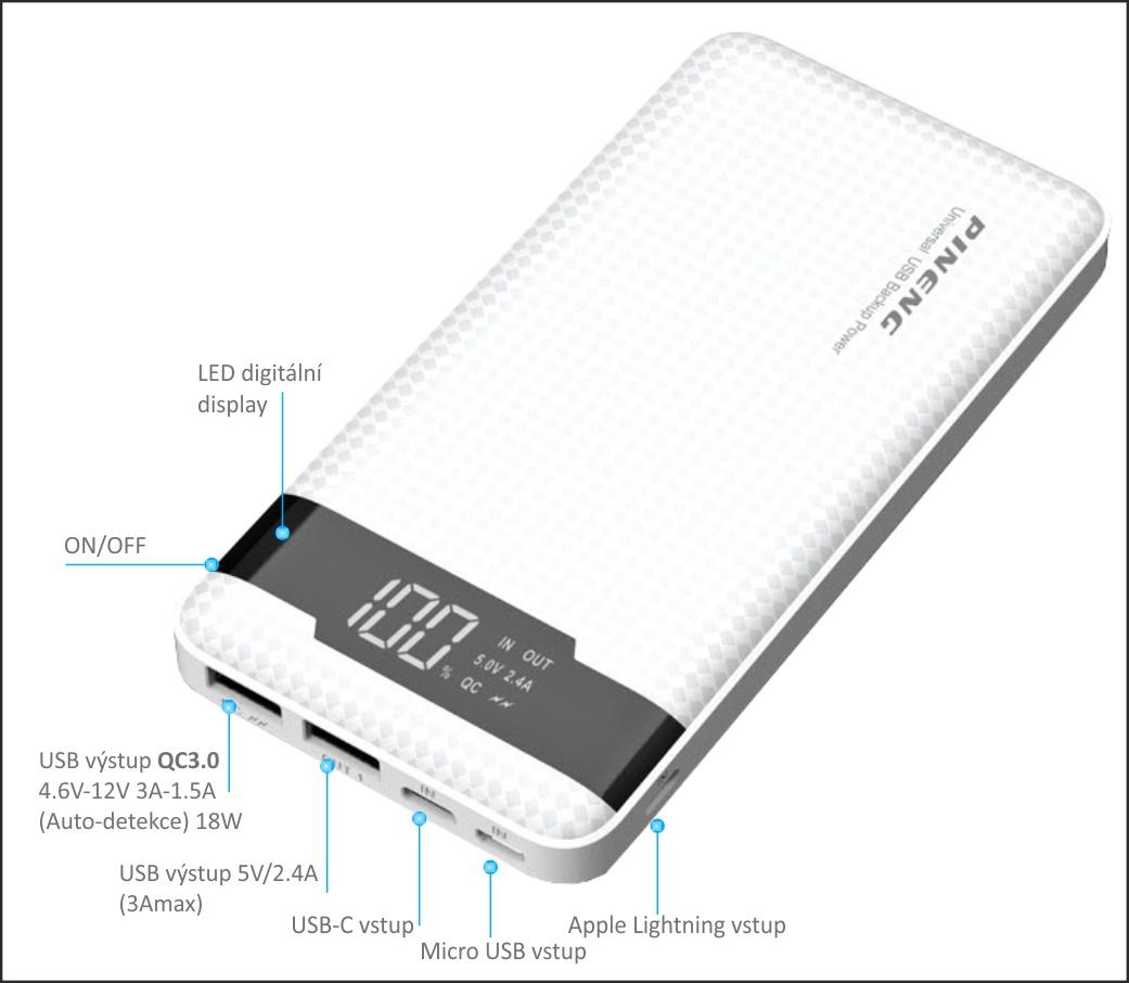 Powerbanka PINENG PN-961 QC3.0 10000mAh, je svojí spolehlivostí, zpracováním a variabilito, světovou špičkou mezi záložními zdroji. Japonská elektronika Vám zajistí veškerou ochranu, jak vaší elektroniky, tak powerbanky samotné. Reálná kapacita 10000mAh je ideální kompromis mezi počtem nabíjení, hmotností a každodenním nošením. I tato kapacita bude dostatečná pro pohotovostní nabíjení všech vašich zařízení, jako jsou mob. telefony, tablety, čtečky knih, GPS, svítilny, foťáky, kamery a mnoho dalších zařízení.