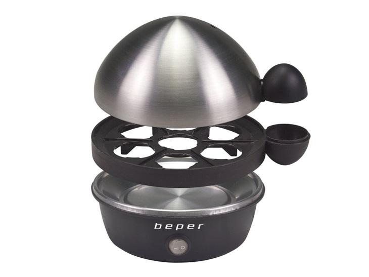 až pro 7 vajec, nerezová topná deska a víko, vyjímatelný držák na vejce, miska pro ztracená vejce, odměrka na vodu s bodcem pro propíchnutí vajíčka, výkon 360 W