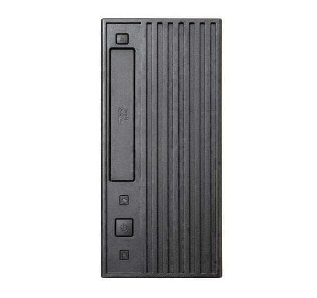 Černá počítačová skříň formátu Mini Tower. Na předním panelu naleznete port 2x USB 3.0, dále také konektor pro sluchátka a konektor pro mikrofon.