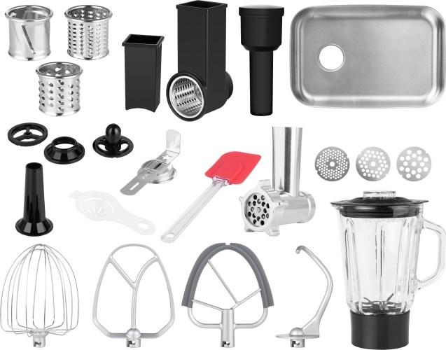 planetární způsob míchání, materiál vnitřních převodů kov, objem mísy 8 l, materiál mísy nerez, počet rychlostí 6 + pulz, materiál pláště kov, plynulá regulace otáček, šlehání, mísení, tvořítka na těstoviny, mlýnek na maso, mixér, strouhadlo, příkon 1800 W