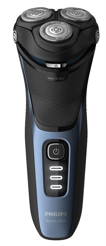 Pánský elektrický holicí strojek Philips řady 3000 pro suché a mokré holení. Hlavy 5D Flex otočné v 5 směrech pro kopírování křivek tváře. Břity Powercut, 3 LED indikátory nabití.Li-ion baterie.Barva: Světle modrá.