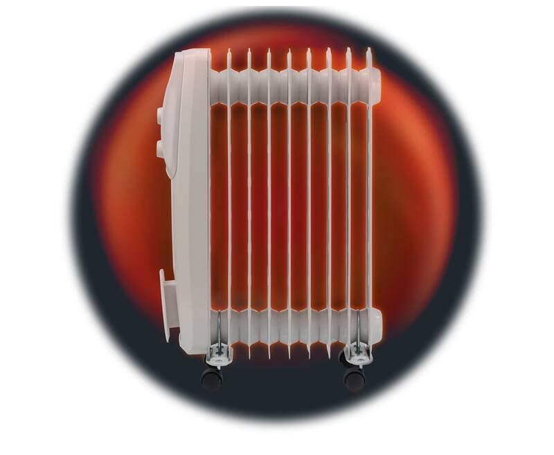 olejový radiátor • kolečka a madlo pro snadnější přenos • integrovaný termostat • 3 stupně výkonu (max. 2 000 W) • dvounásobný ochranný systém • prostor pro uložení kabelu • hlučnost 35 dB • 1,8m kabel