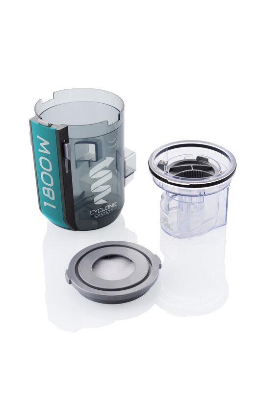 Cyklonový systém vysávání zachytí veškeré nečistoty, které se následně usazují ve speciální bezsáčkové nádobě s filtrem. Na dokupování náhradních sáčků do vysavače tak můžete s klidem zapomenout. Vyprázdnění plné nádobky je snadné, stejně jako veškerá manipulace i výměna příslušenství.