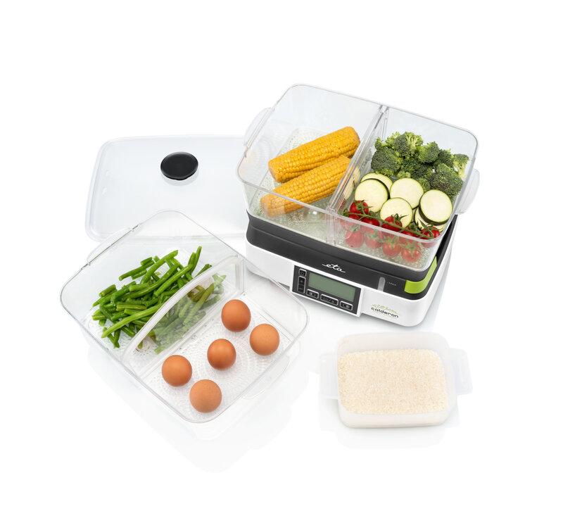 Parní hrnec ETA Calderon II se 2 transparentními nádobami vám usnadní zdravé vaření. Celková kapacita 11 l je dostatečně velkorysá pro přípravu rodinného oběda, zároveň je však vaření v něm natolik rychlé, že jej rádi využijete, i když chystáte jídlo jen sami pro sebe.