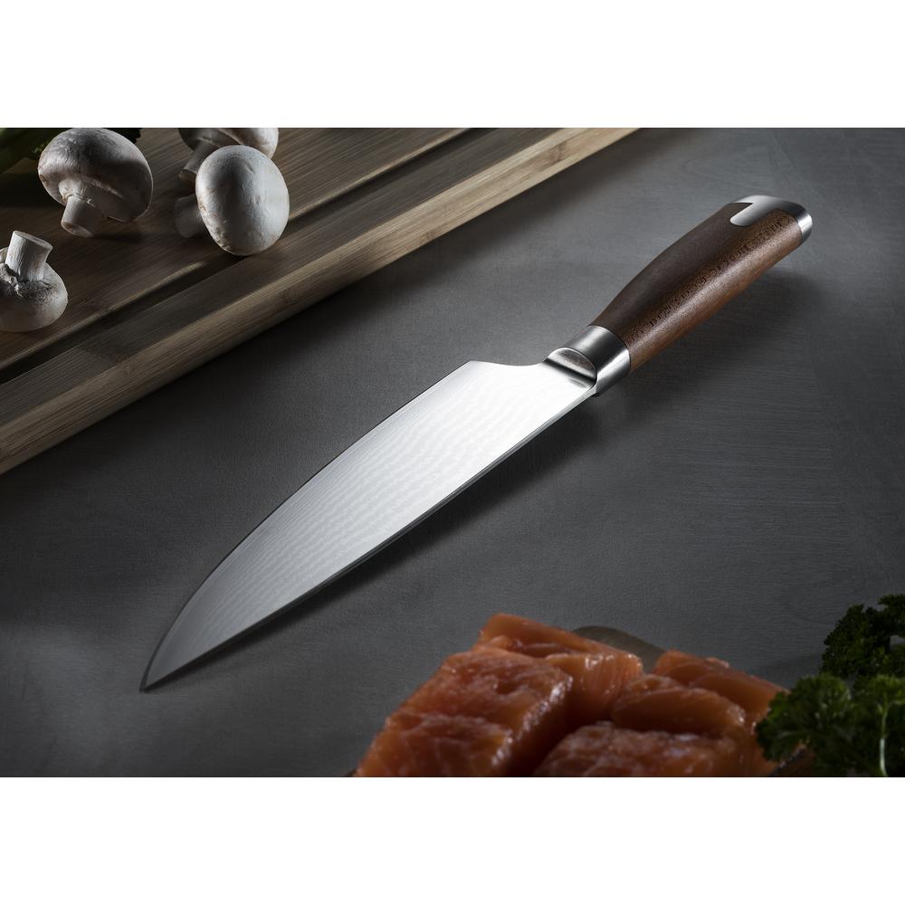 Universální japonský kuchařský nůž typu Gyuto patří k základnímu vybavení japonských kuchařů. Má všestranné využití, je velmi silný a ostrý, proto je ideální na krájení masa, ryb a zeleniny. 203/338 mm