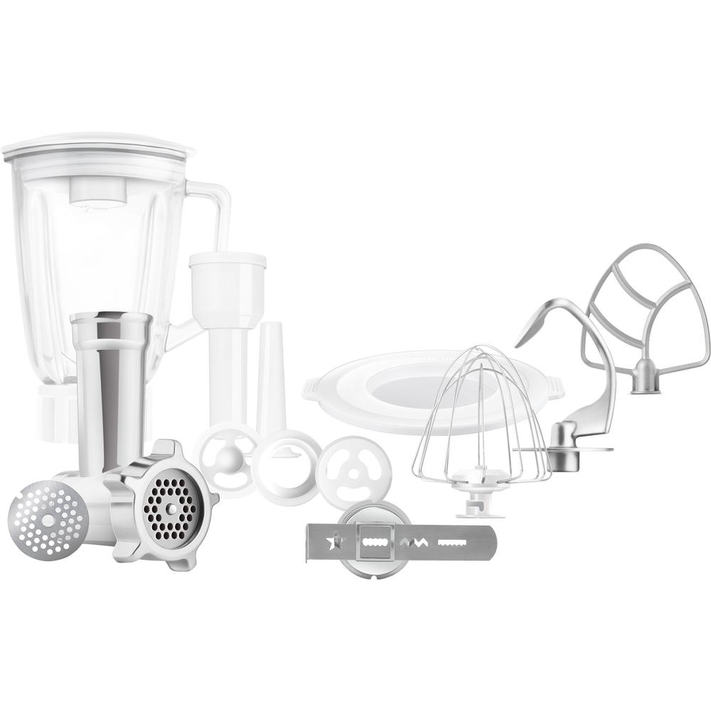 Kuchyňský robot, Příkon 1000 W, 4,5 l nerezová nádoba s měrnou stupnicí, 1,5 skleněný mixer, aretační pojistka v horní poloze výkyvného ramene, masomlýnek na hrubé a jemné mletí, 3 nástavbce na hnětení, šlehání a lehká těsta.