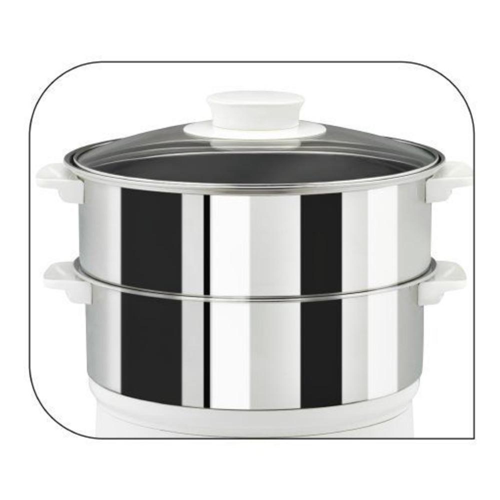 Tento parní hrnec se dvěma nádobami se snadno skladuje, protože nádoby lze uspořádat dnem vzhůru na základnu a zajistit tak kompaktní velikost. Časovač s automatickým vypnutím poskytuje snadné používání. Do parního hrnce lze během vaření kdykoliv snadno doplňovat vodu, hladina vody je navíc vždy vidět. 60minutový mechanický časovač se zvukovým upozorněním signalizuje, když je jídlo hotové. Viditelný ukazatel hladiny vody, 2 stohovatelné nádoby, objem 6 litrů.-