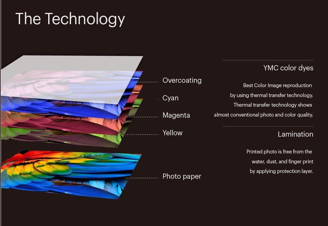 Nejvyšší kvalita okamžité fotografie na trhu Fotografie vznikají technologii termosublimačního tisku D2T2 – 4 PASS, která se běžně používá v kioskových řešeních, foto koutcích nebo domácích foto tiskárnách k PC. Tato technologie dosahuje nejvěrnějšího podání barev. Na fotografický papír se nanáší postupně 3 barvy – žlutá, purpurová a azurová. Reprodukce barev dosahuje neuvěřitelných 16,7 milionů barev. Poslední čtvrtá vrstva je vrchní laminace, která zachovává kvalitu obrazu. Barva tak nebledne a barvy zůstanou krásně zářivé a živé. Tato technologie tak přináší nejvyšší kvalitu fotografie na trhu oproti technologii Instax, Polaroid a ZINK papíru.