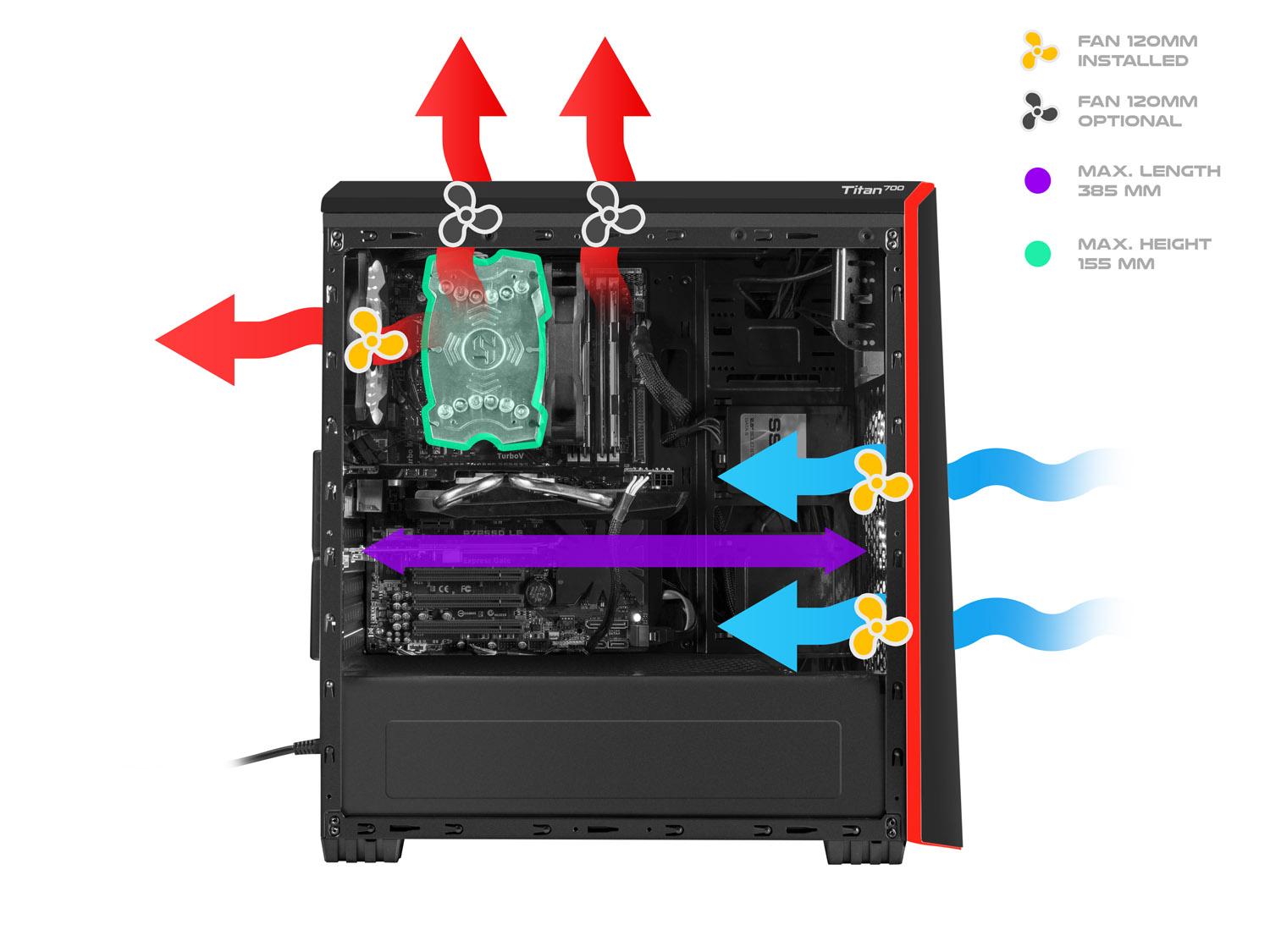 Genesis Titan 700 je prostorná a funkční počítačová skříň v moderním designu. Skříň poskytuje prostorný vnitřek, který směstná i ten nejvýkonnější hardware. Skříň je vybavená průhlednou bočnici a třemi 120mm ventilátory s červeným podsvícením.