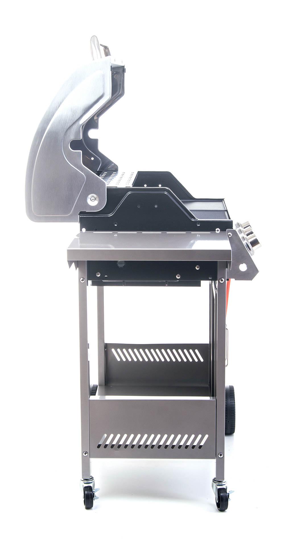 Vsadili jsme na klasiku. Kvalitní nerezový povrch, pevnost, odolnost a spolehlivost poctivé litiny. Litinový rošt a litinový plát jsme doplnili systémem Flame Tamer, který prodlužuje životnost tří nerezových hořáků s elektrickým zapalováním a plynovou regulací, dimenzovaných na maximální výkon 3,5 kW.