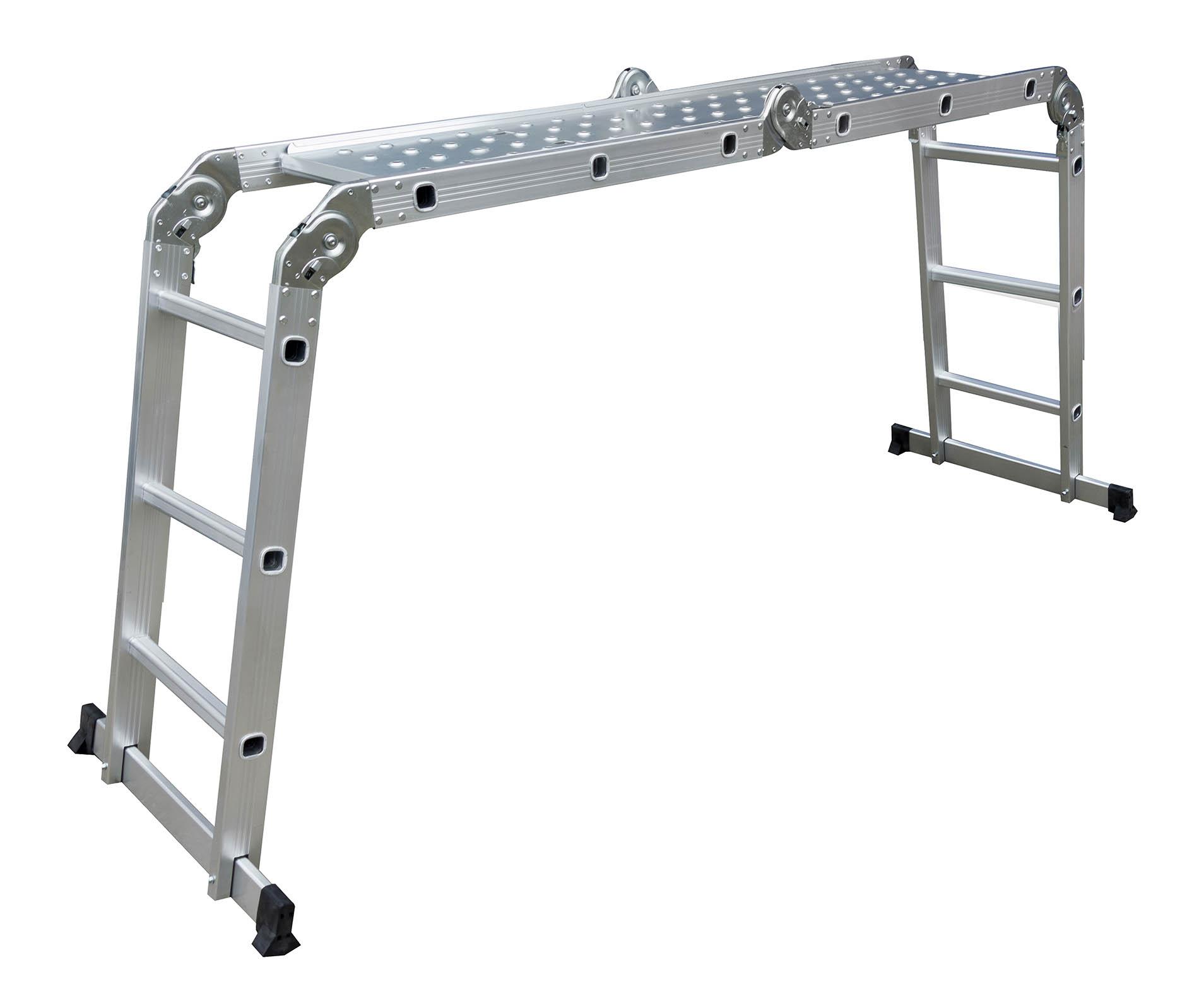 Hliníkové štafle, Délka složených štaflí: 1,8 m, Výška v pozici lešení: 1 m, Maximální délka rozloženého žebříku: 3,7 m, Váha: 15 kg, Nosnost: 150 kg