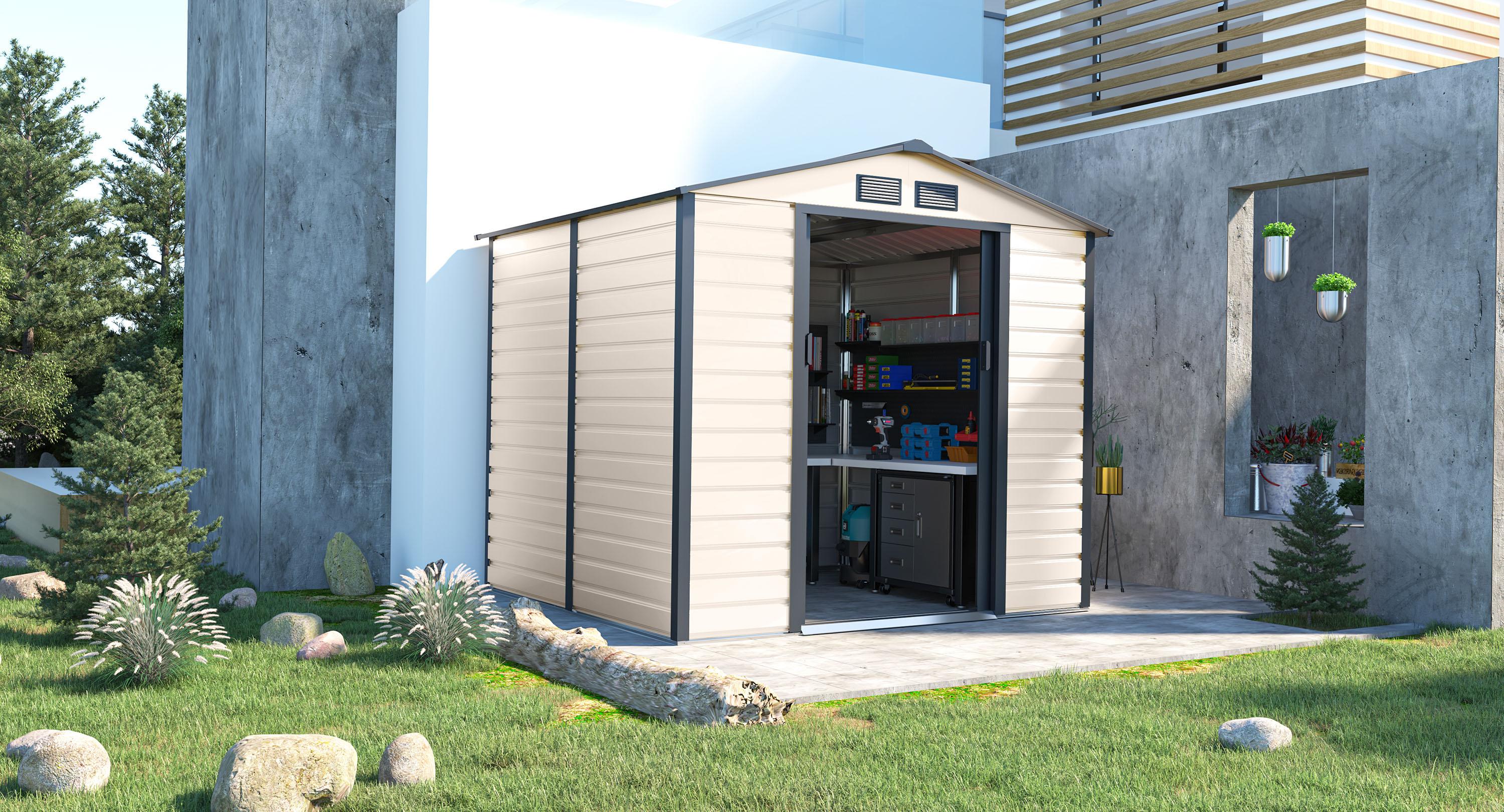 Zahradní domky na nářadí v moderním designu se hodí do každé zahrady. Vstupní dveře jsou dostatečně široké, proto do domečku pohodlně uložíte své nářadí, zahradní kolečko i venkovní nábytek.