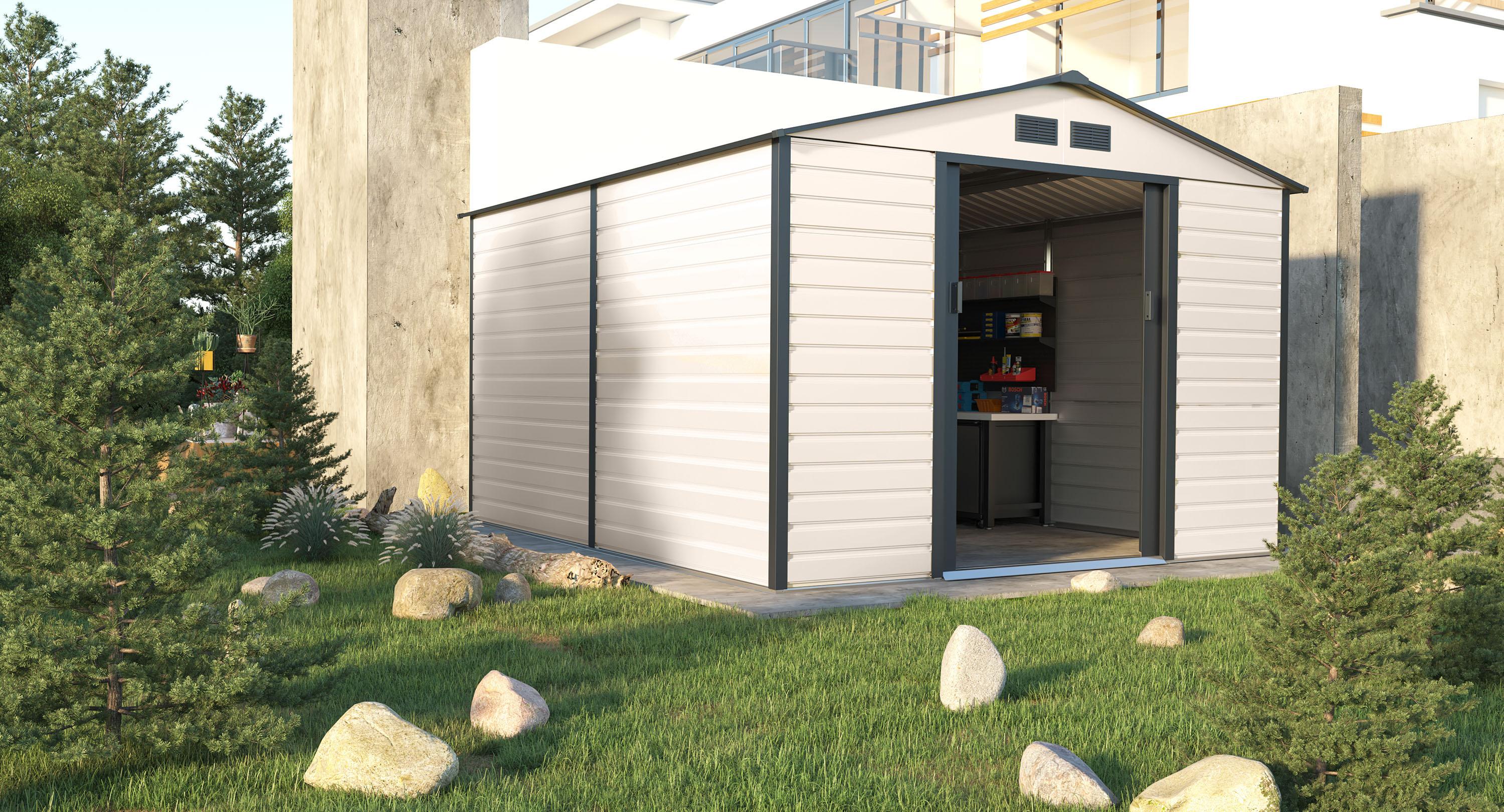 Zahradní domky na nářadí v moderním designu se hodí do každé zahrady. Vstupní dveře jsou dostatečně široké, proto do domečku pohodlně uložíte své nářadí, zahradní kolečko i venkovní nábytek.