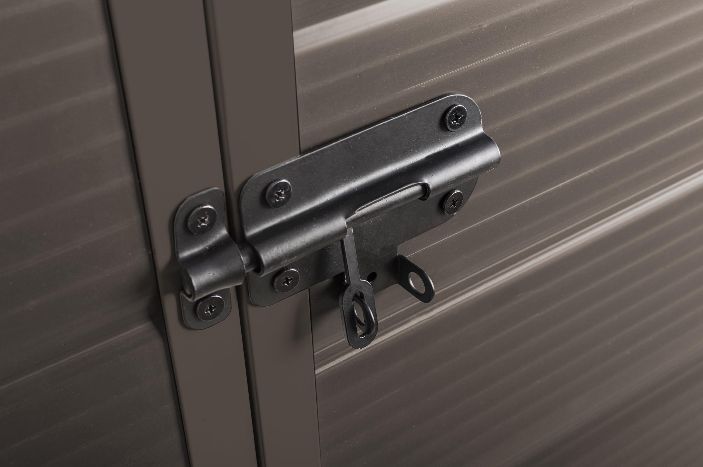 Nad dvoukřídlými dveřmi je umístěna ventilační mřížka, která zajišťuje dostatečné odvětrávání a cirkulaci vzduchu uvnitř domku. Proto se nemusíte bát plísní nebo srážení vody na stěnách v případě náhlých změn teploty.