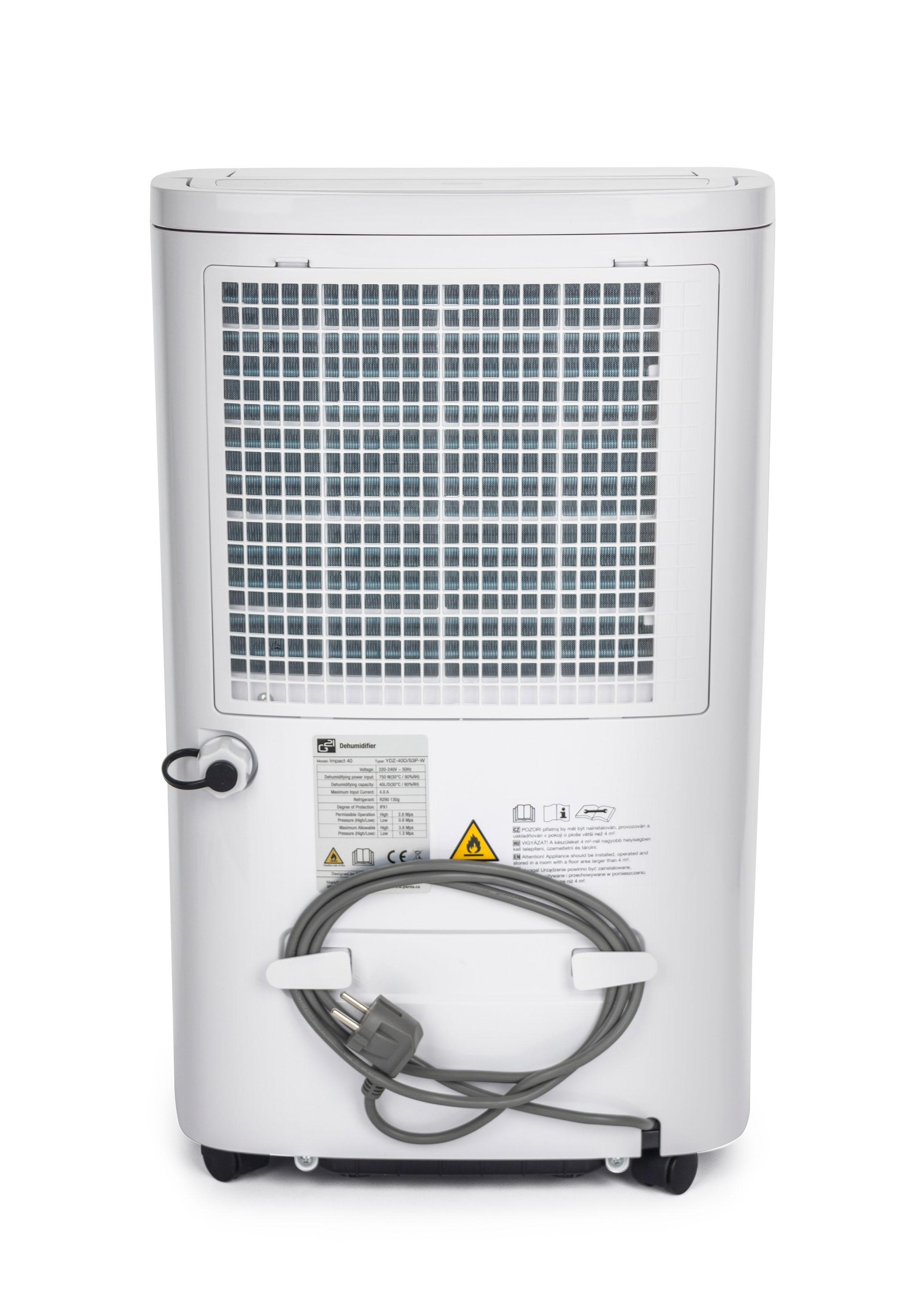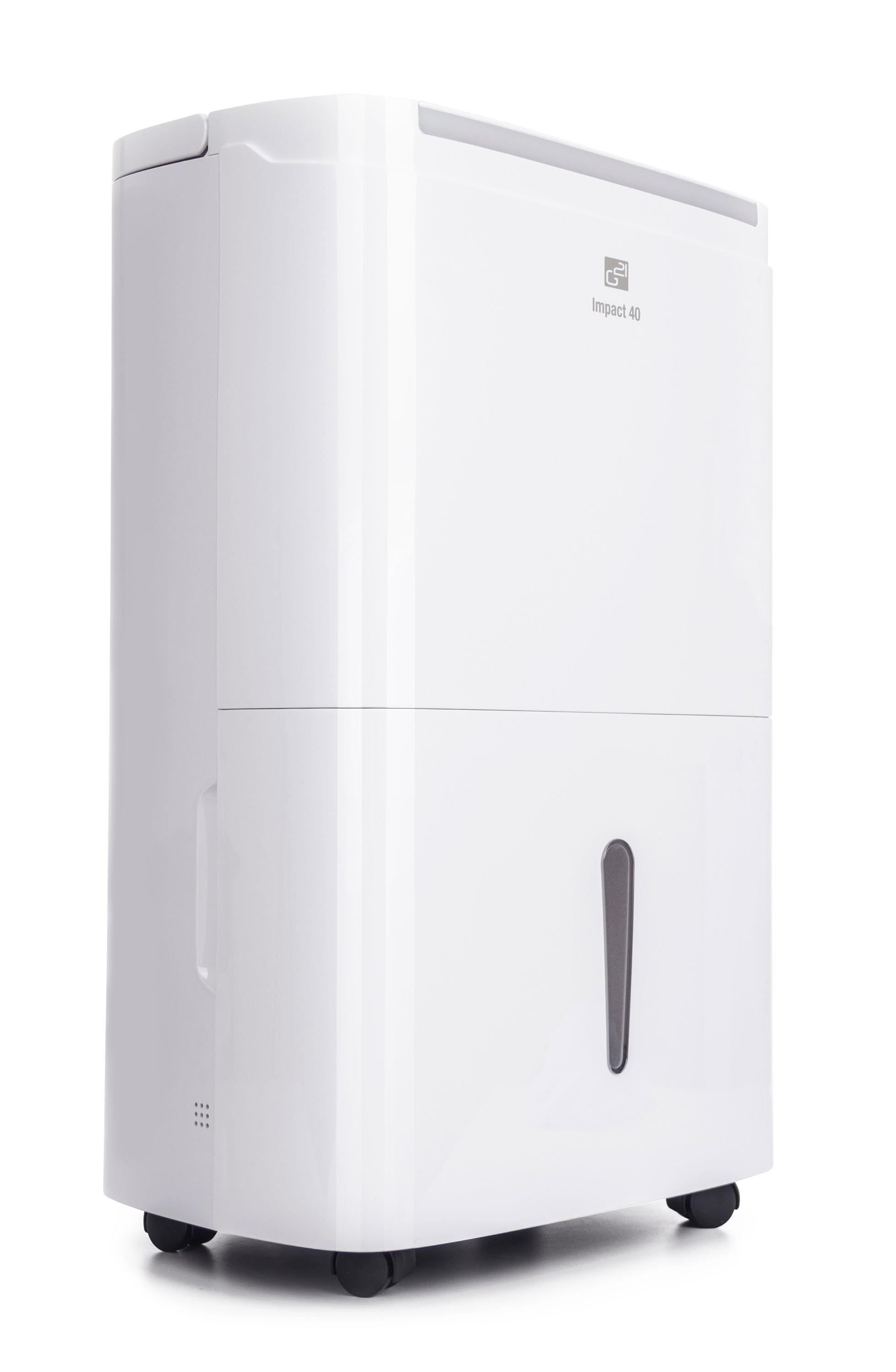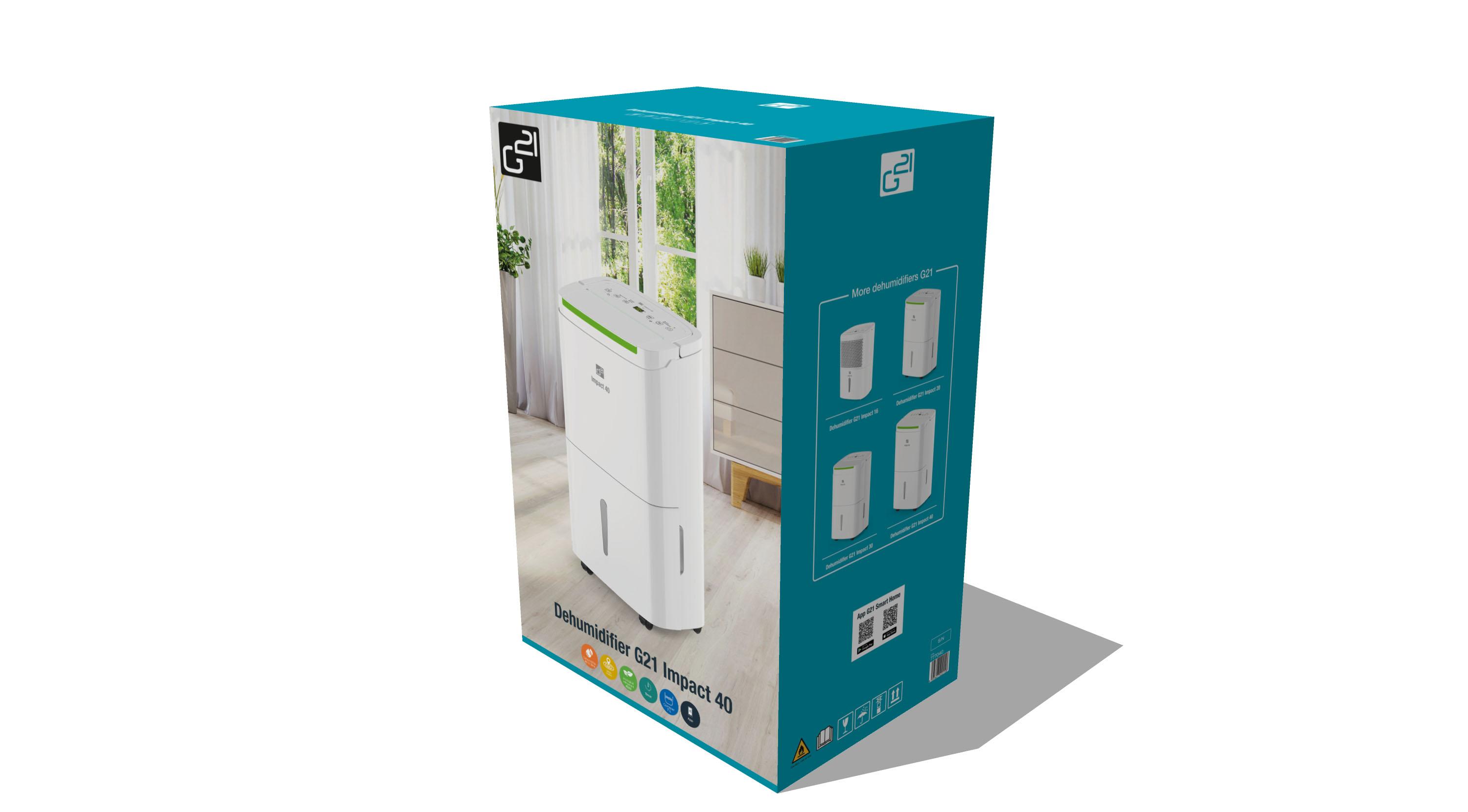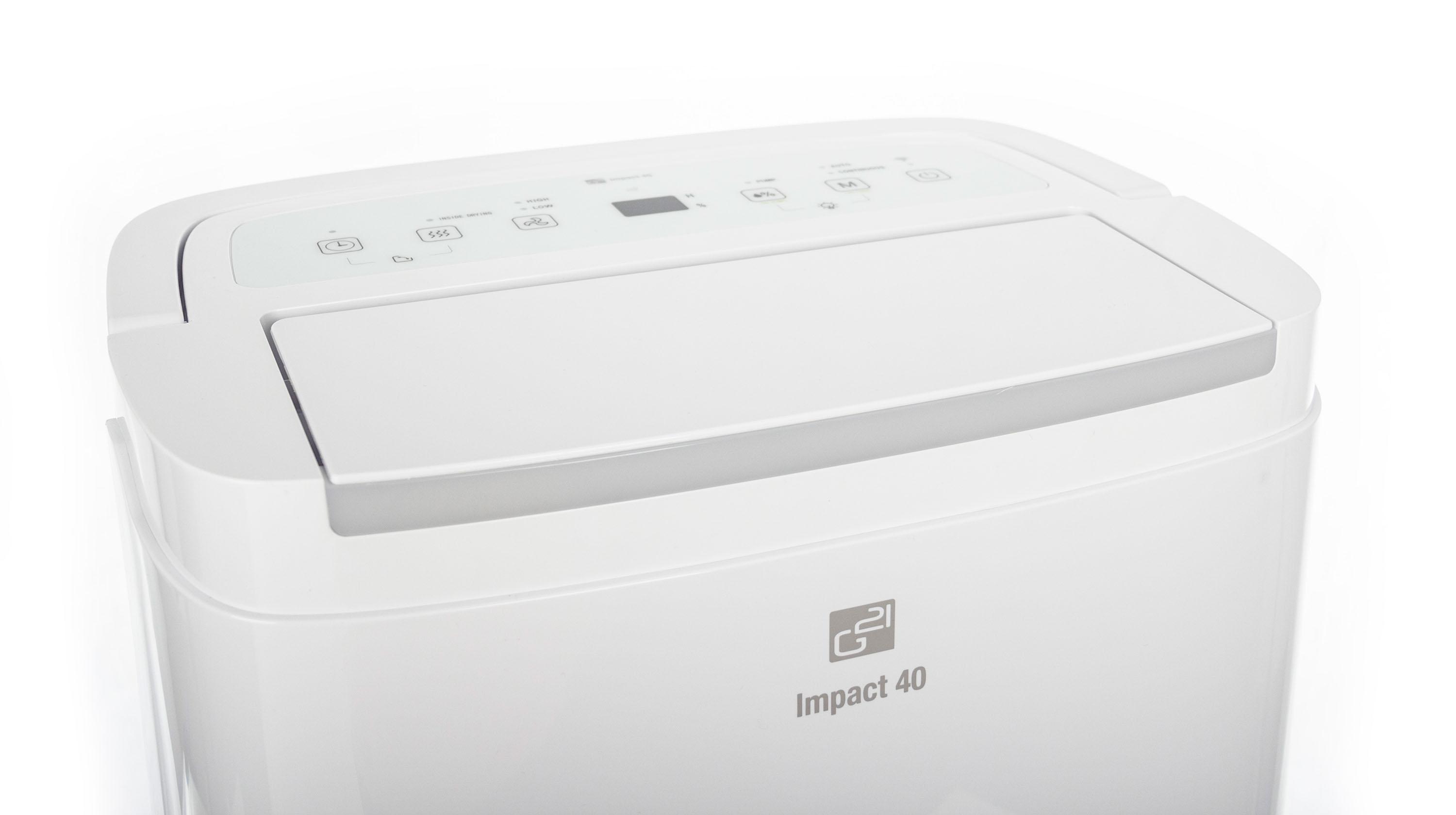 Odvlhčovač vzduchu G21 Impact 40 od české značky G21 má kapacitu 40 l za 24 hodin. Je vybaven 7l, dostatečně velkou nádržkou na kondenzát s průhledným indikátorem stavu. Pozorovat jej však ani nemusíte – odvlhčovač se při naplnění nádržky sám vypne. Odvlhčovač používá ekologické chladivo R290, které nepoškozuje ozónovou vrstvu.