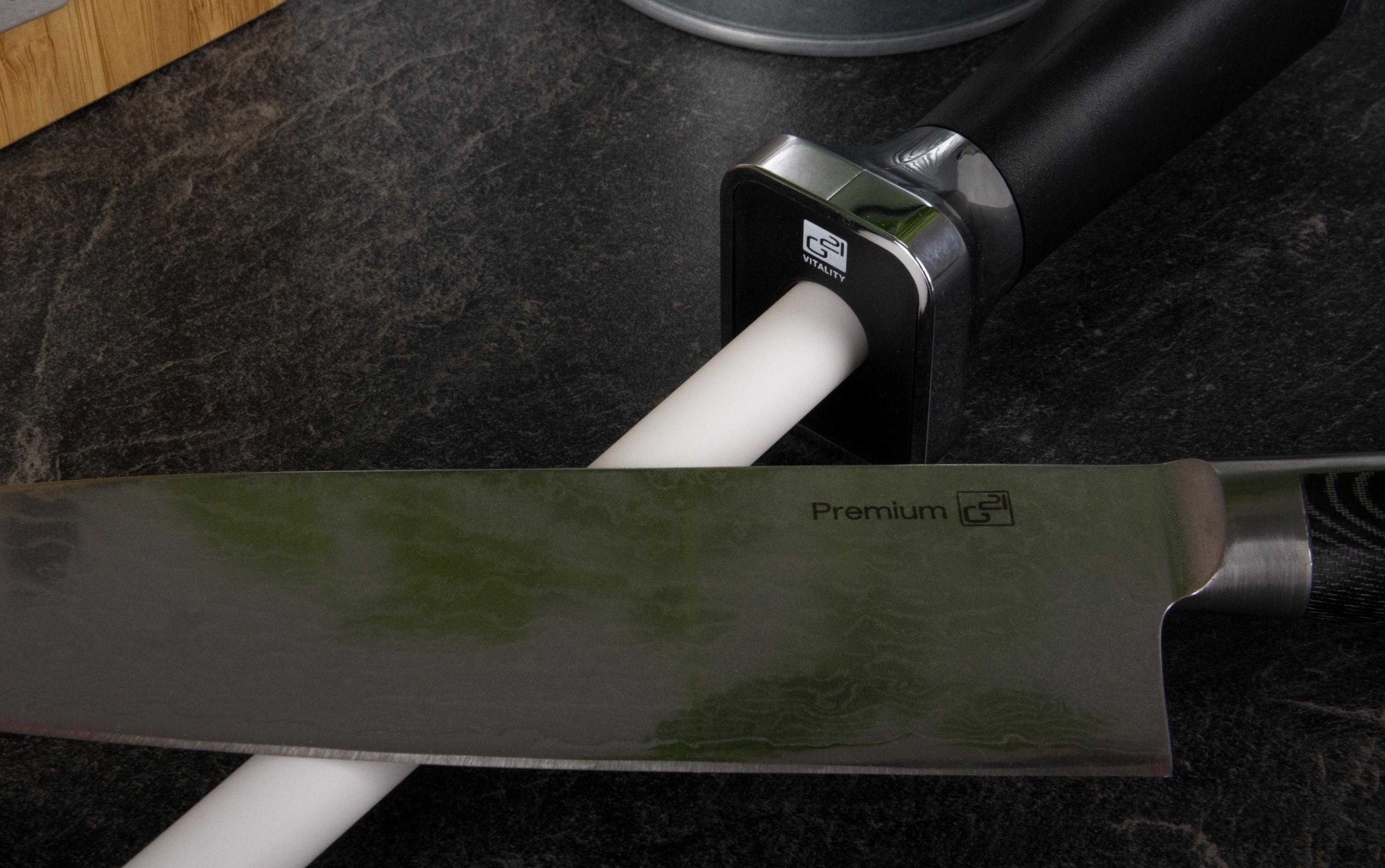 - Přiložte nůž tak, aby se čepelí dotýkal keramické brusné části ocílky pod správným úhlem (klasické nože 25–30 °, damaškové nože 20–25 °) a volným tahem přejíždějte ostřím nože po povrchu ocílky.