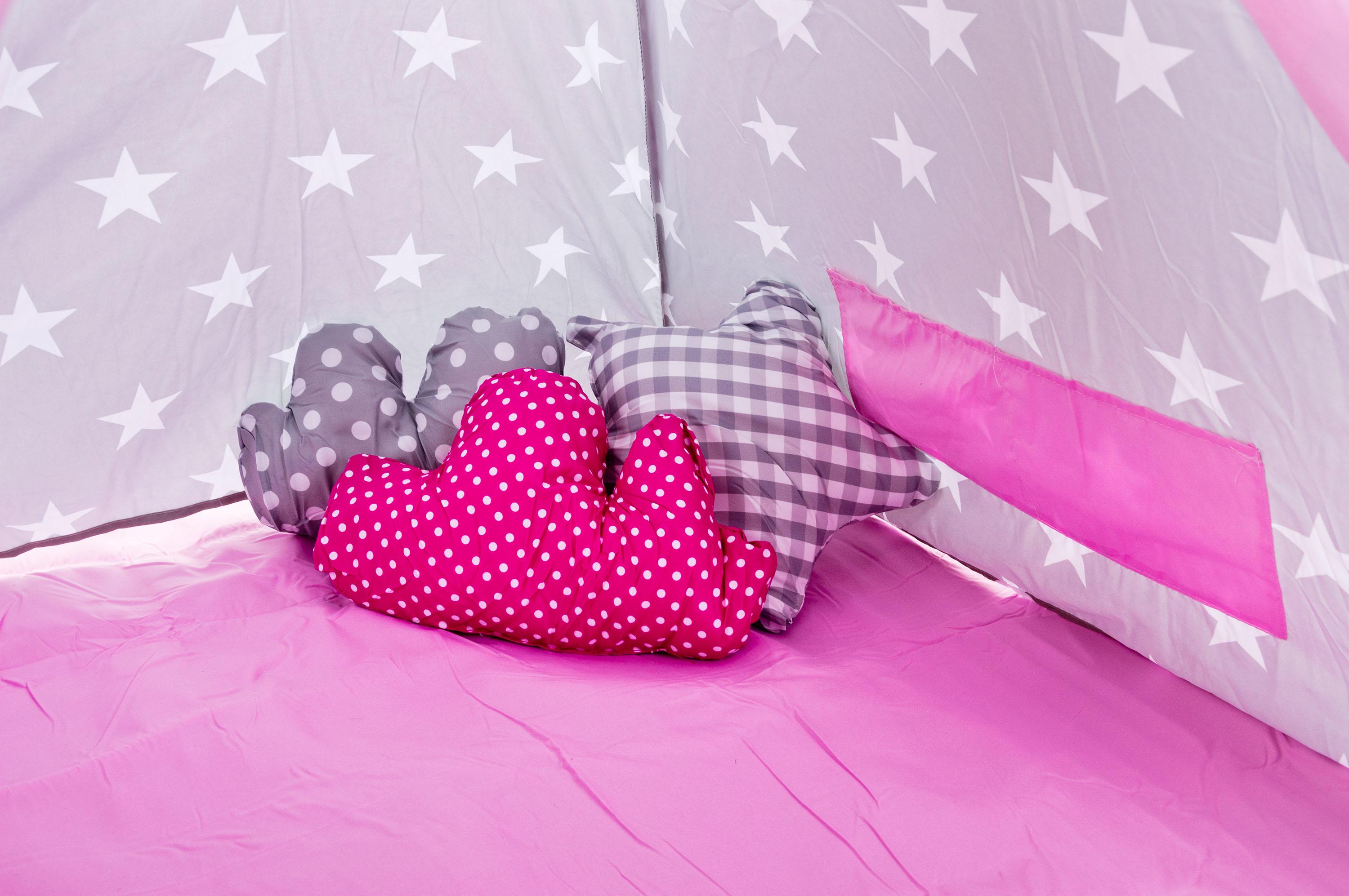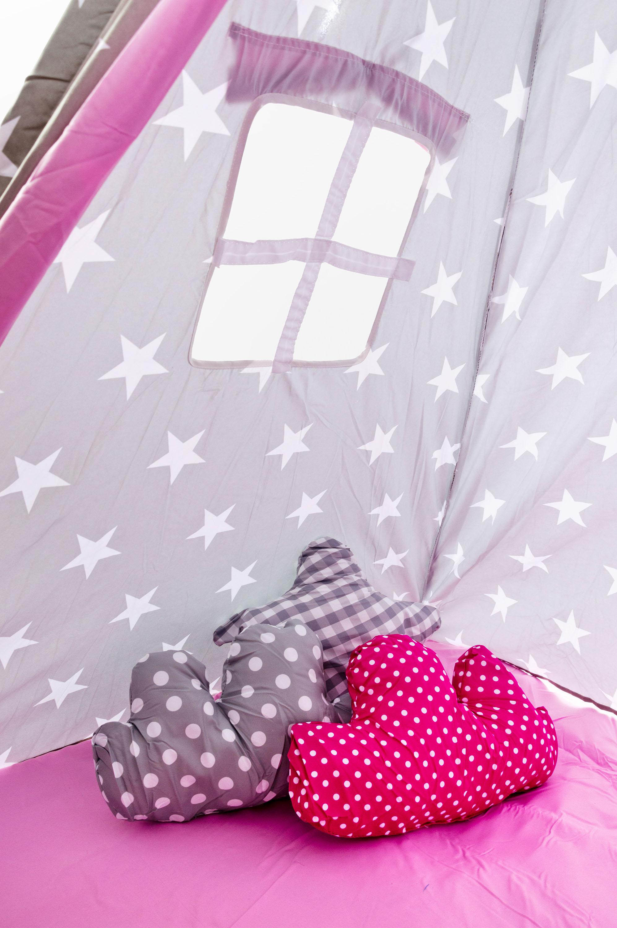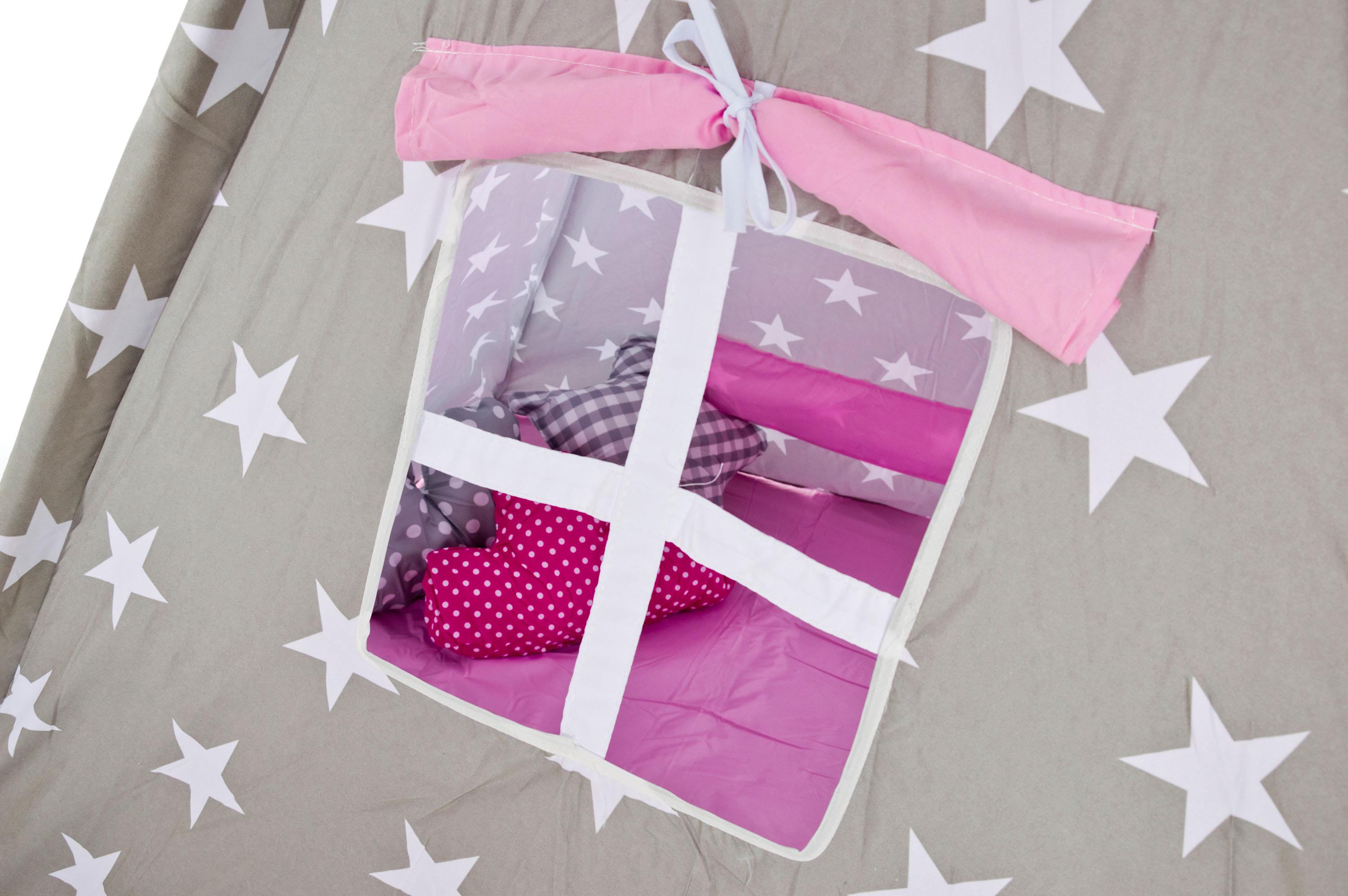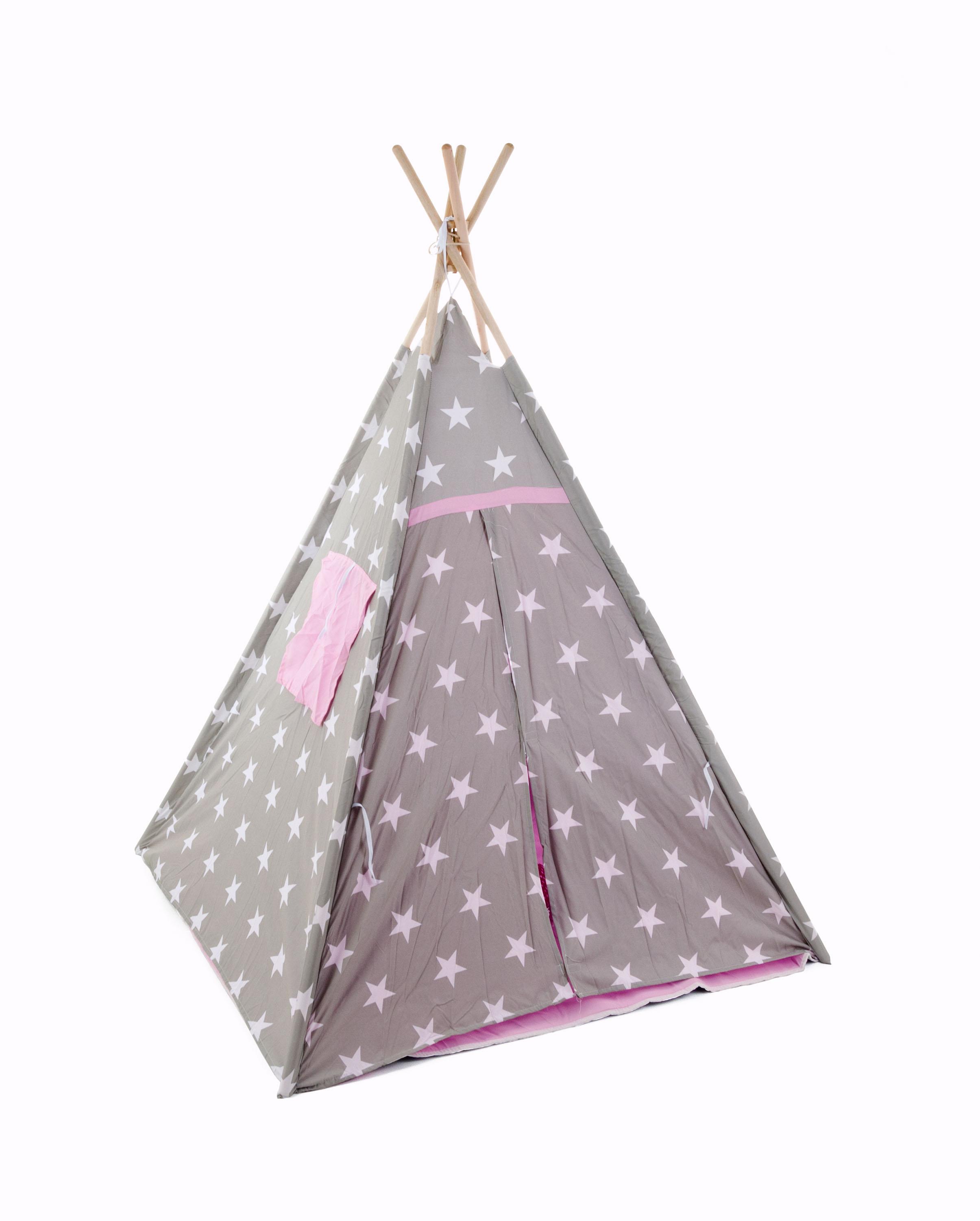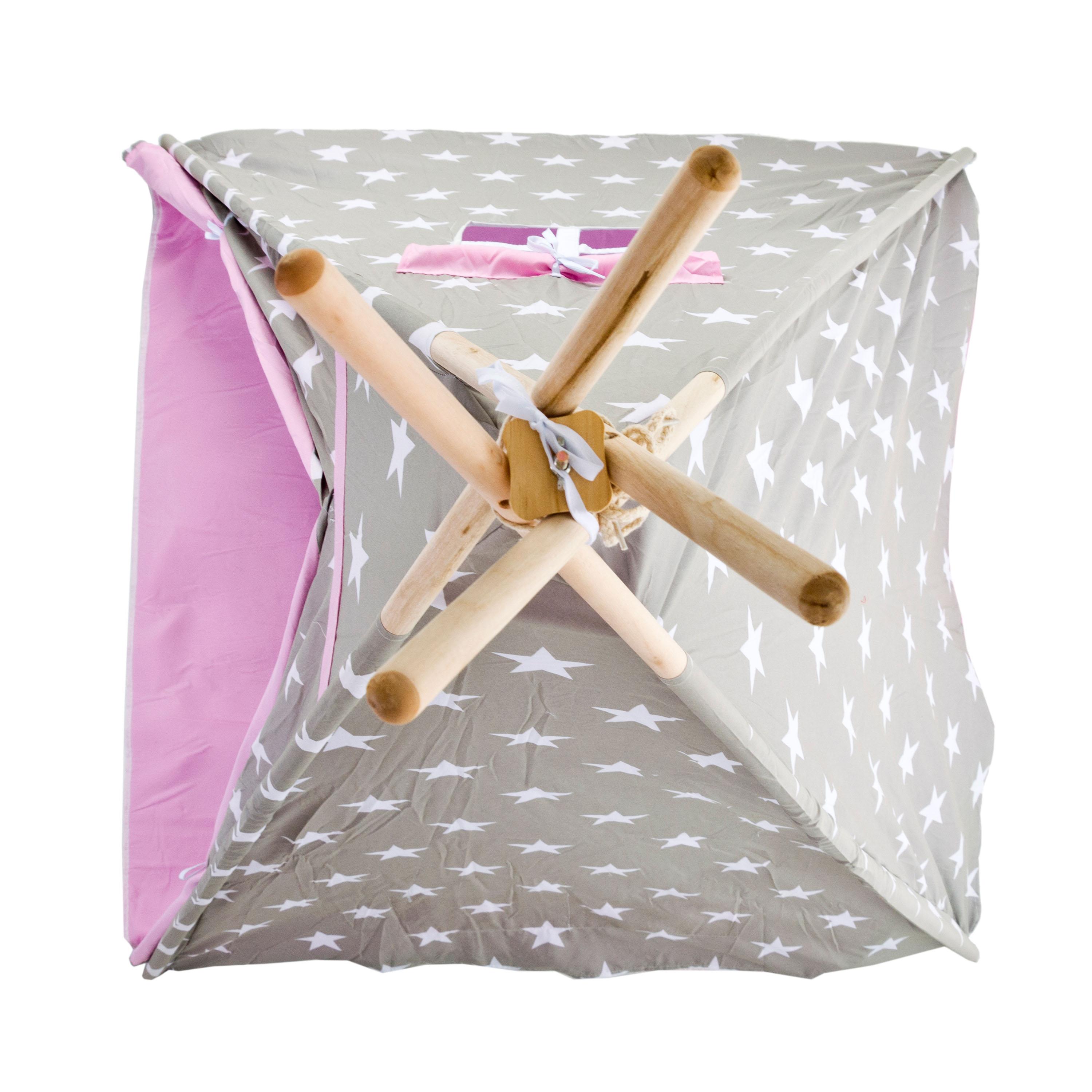 Dětské teepee, Materiál stanu: ponžé Materiál montážních tyčí: dřevo Výška stanu: 160 cm Délka montážních tyčí: 185 cm Rozměry podlahy: 120 x 120 cm Barva: šedá / růžová, bílé hvězdy Hmotnost: 2,7 kg