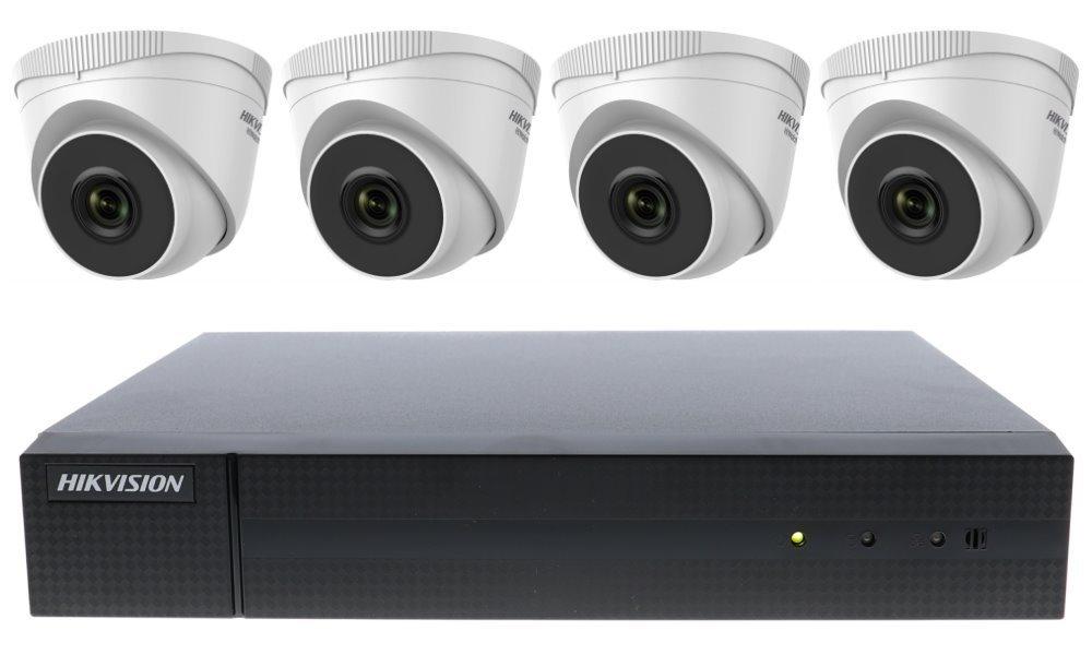 Sestava záznamového zařízení s předinstalovaným 1 TB diskem a čtyř 4 Mpx kamer. Součástí sady je napájecí zdroj a čtyři 18 m propojovací kabely Cat5e pro přenos videa i napájení.