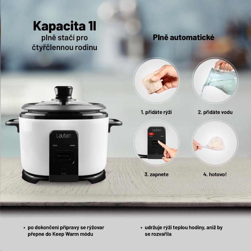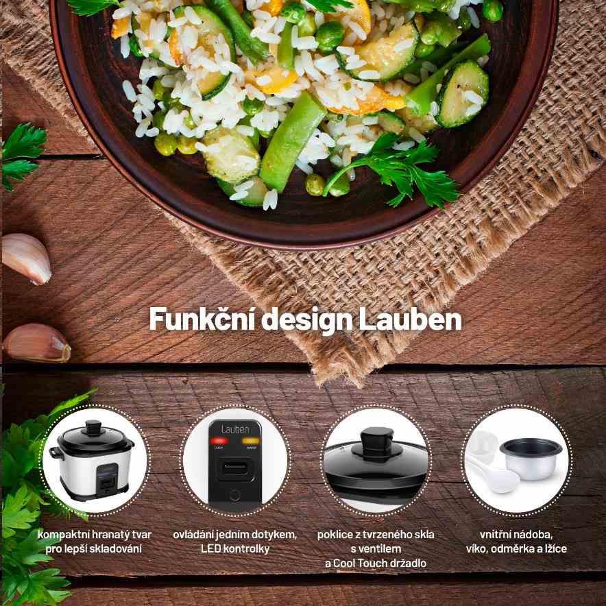 Uvařit vláčnou a nadýchanou rýži je často mnohem těžší, než by se mohlo zdát. S rýžovarem Lauben je to ale stejně jednoduché, jako si tuto oblíbenou přílohu vychutnat. Jeho využití je všestranné, připravíte v něm jakýkoli druh rýže přesně al dente, stisknutím jednoho tlačítka. Ale poradí si i s jinými surovinami. Během několika minut za vás zvládne lahodné polévky, krémovou cereální kaši nebo luštěniny bohaté na bílkoviny. Samozřejmostí je funkce Keep warm, díky které je rýžovar schopný udržet rýži teplou tak dlouho, jak potřebujete, aniž by se rozvařila a ztratila dokonalou chuť nebo strukturu.