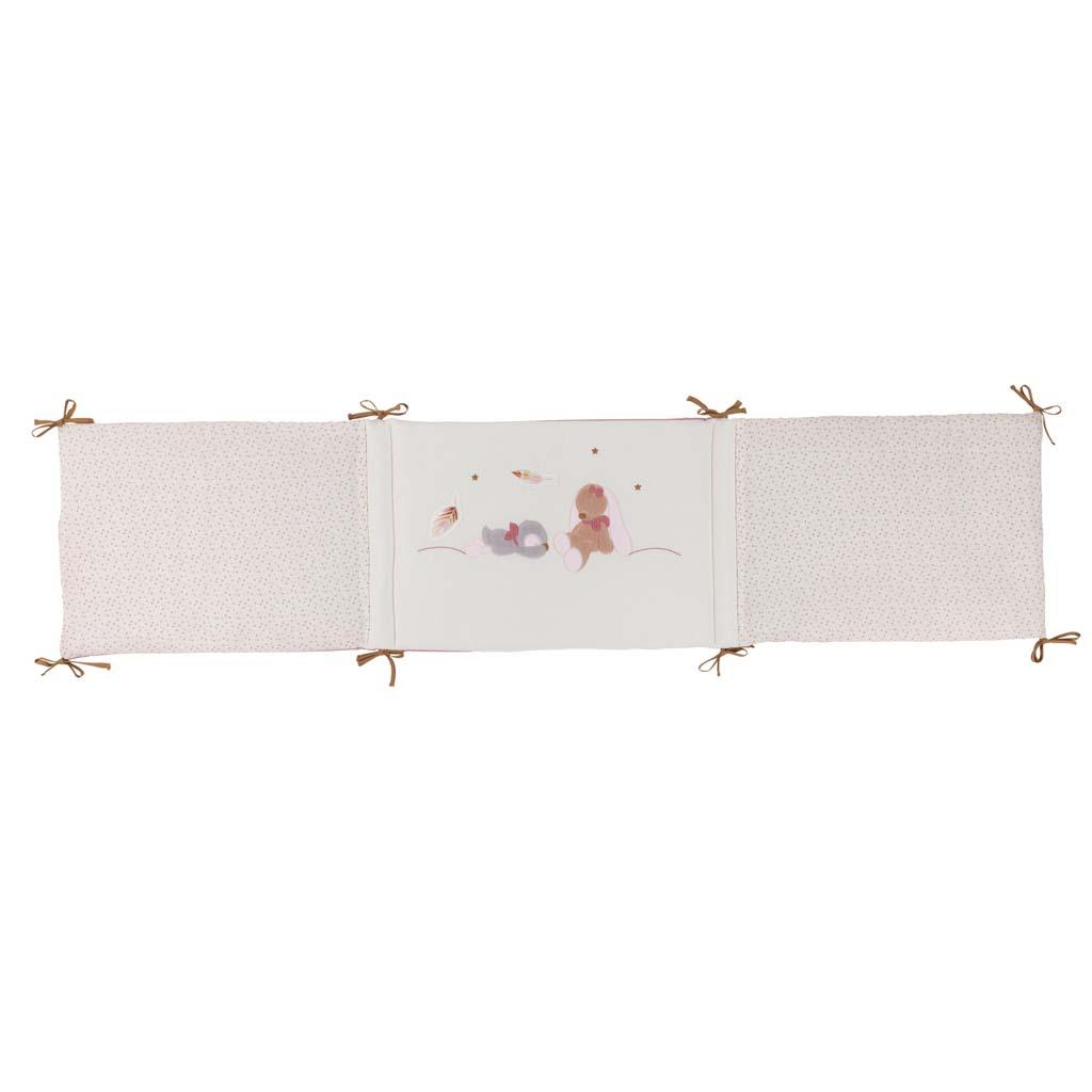 Ochranný mantinel do postýlky s krásnými aplikacemi zabraňuje nárazům dítěte do boků postele a vytváří útulné a bezpečné prostředí na spaní. Vhodné pro postele o šířce 60 - 70 cm. Šňůrky pomáhají jednoduchému přivázání k postýlce. - chrání dítě před nárazem do tvrdých boků postele - oboustranné využití - pěkné decentní aplikace - možnost praní na 30 ° C Rozměry: 180 x 40 x 3 cm Materiál: polyester Doporučujeme dodržovat prací symboly.