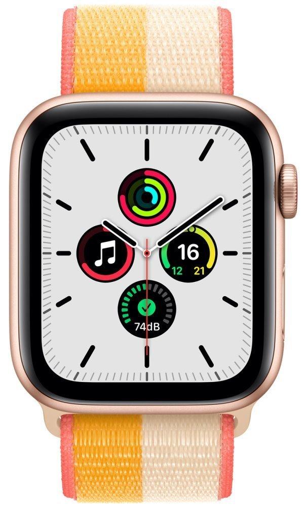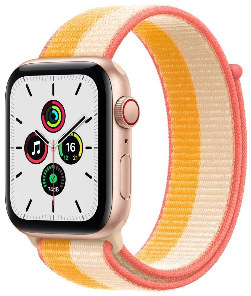 Chytré hodinky APPLE Watch SE GPS Cellular, 44mm zlatý hliník s žluto bílým provlékacím sport řemínkem