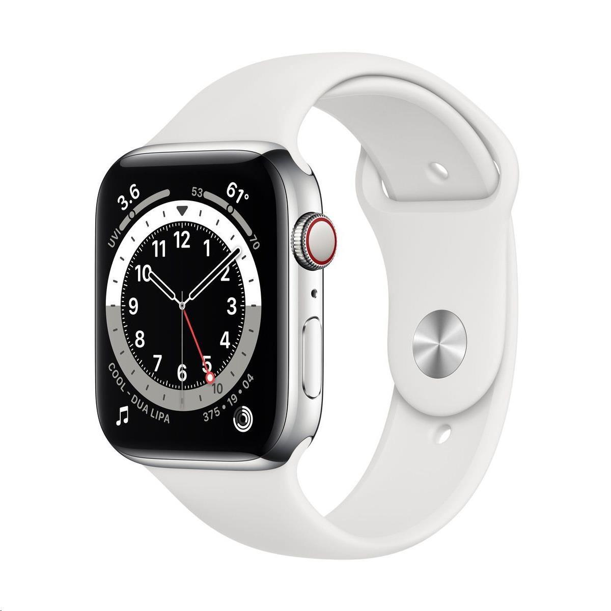 Chytré hodinky APPLE Watch Series 6 Cellular 44mm Stříbrný nerez s Bílým sprotovním řemínkem