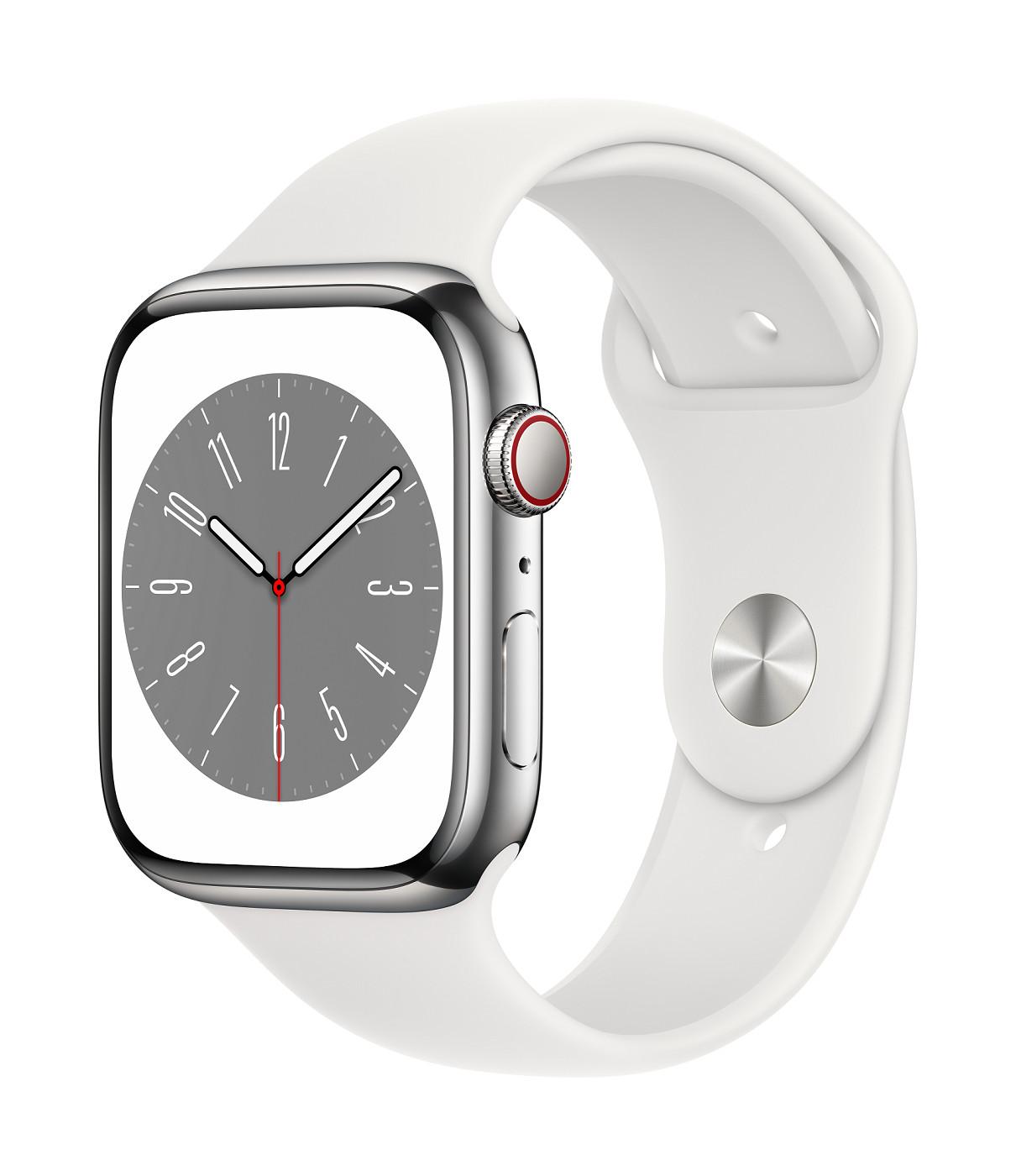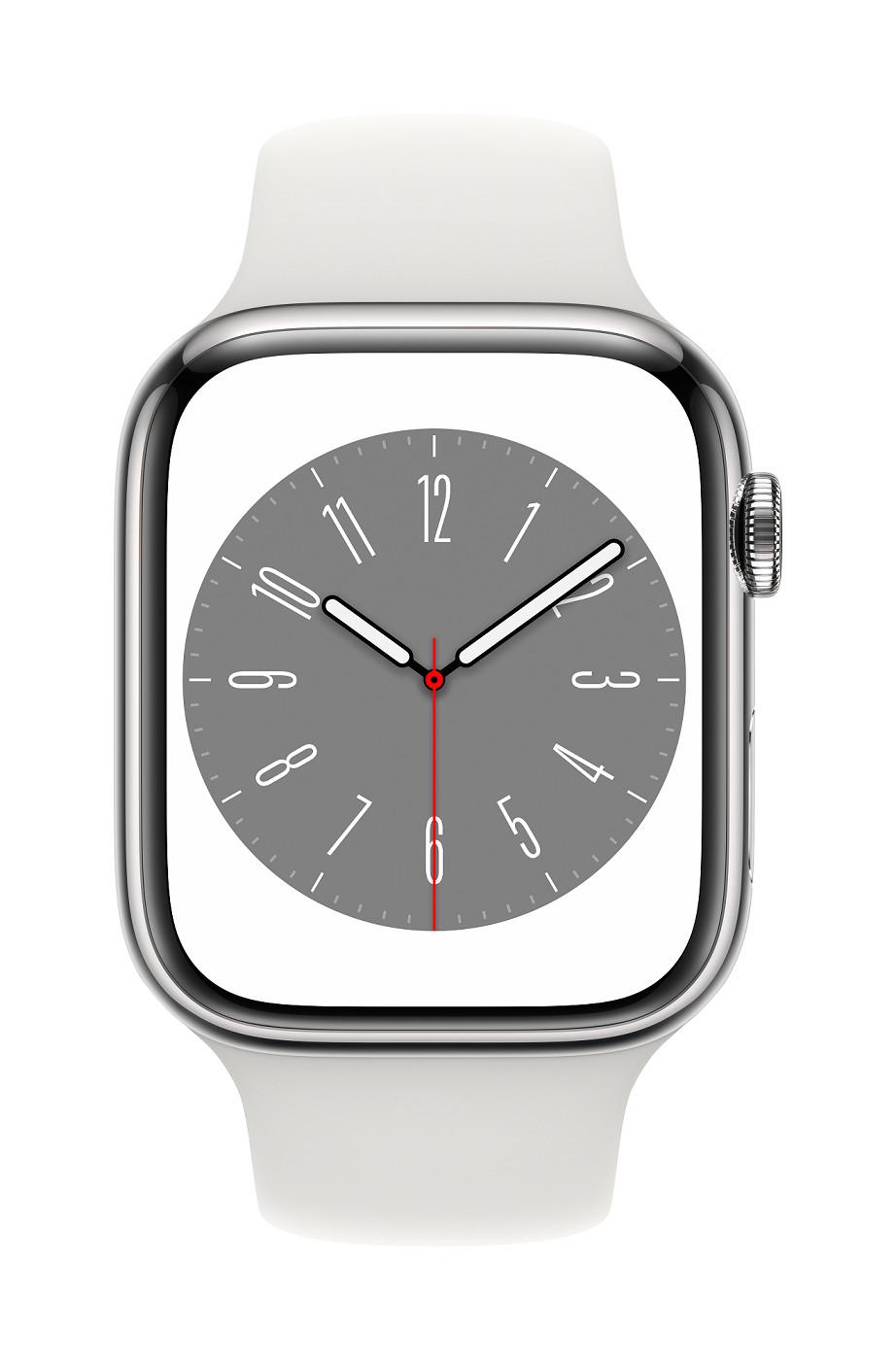 Chytré hodinky APPLE Watch Series 8 GPS + Cellular 45mm Silver Stainless Steel Case with White Sport Band - Reg
