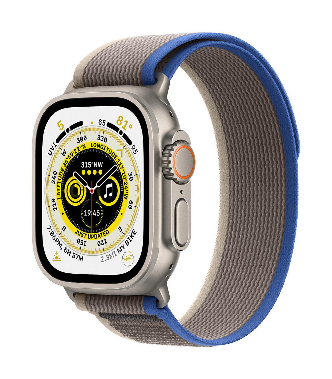 Chytré hodinky APPLE Watch Ultra GPS + Cellular, 49mm Titanium Case with Blue/Gray Trail Loop - M/L