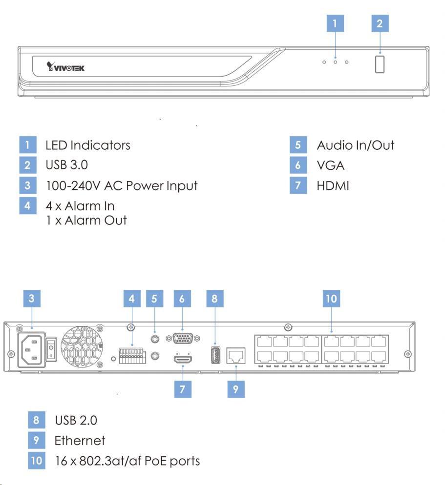 NVR podporuje technologii Smart VCA implementované v kamerách, která je založena na Deep learning (strojové učení) technologiích. Umožňuje snadno prohledávat záznamy podle jednoho nebo více typů událostí. Zařízení je vybaveno dvěma porty USB a je kompatibilní s IP kamerami třetích stran standardu ONVIF Profile S. Prostřednictvím webového rozhraní lze požádat technické oddělení výrobce VIVOTEK o pomoc formou vzdálené připojení do Vašeho NVR.