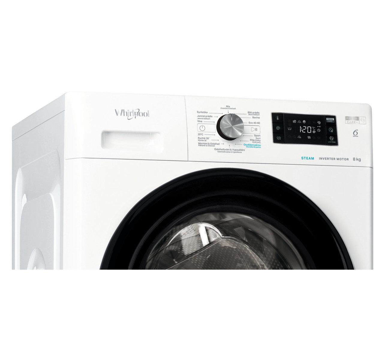 Whirlpool FreshCare+ FFB 8458 BV CS je zepředu plněná pračka v energetické tříde B s velkým displejem pro zobrazení funkcí, teploty a času.