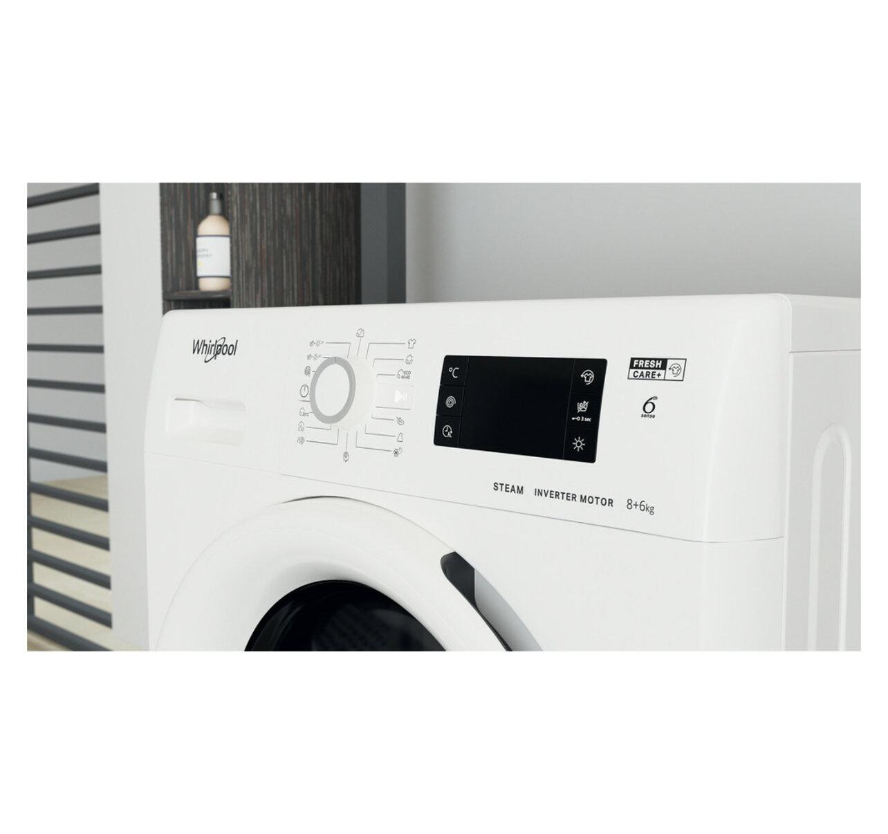 Whirlpool FWDG 861483E WV EU N představuje kombinovanou pračku se sušičkou v energetické třídě D s kapacitou 8 kg praní a 6 kg sušení. Nabízí přehledný displej se zobrazením funkcí, teploty a času. Je vybavena technologií 6.SMYSL, která automaticky upravuje prací a sušící cyklus, aby uspořila energii, čas a vodu.