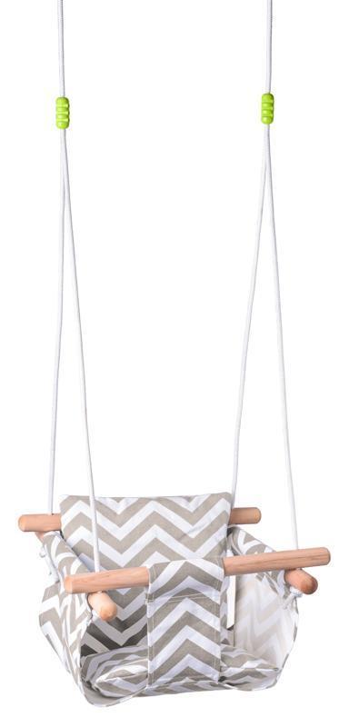 Komfortní dětská houpačka pro nejmenší, je tvořena masivním, hladce broušeným, dřevěným rámem a textilním materiálem (100% bavlna) v šedém provedení. Je ideální pro odpočinek nejmenších dětí, odnímatelný polštářek zajišťuje pohodlné sezení v houpačce. Dítě lze do houpačky bez námahy vložit a za lehkého pohupování mohou děti příjemně odpočívat. Kovové kroužky a odolné, pevné lana slouží k snadnému zavěšení do téměř všech typů houpačkový háků. Lze použít ve venkovních i vnitřních prostorách. Lana jsou vybaveny lanovými zámky pro nastavení optimální výšky. Max. nosnost: 60 kg. Rozměr: 40 x 40 cm. Délka lana: 120-160 cm max. Věk: 6m +